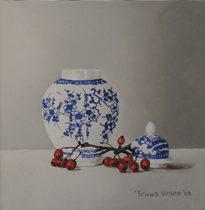 Blauw,wit vaasje en rode bessen